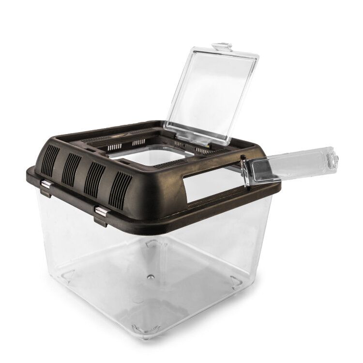 Фаунариум оборудован удобными ручками, что позволяет использовать его в качестве переноски, дополнительные небольшие дверцы дают возможность кормить и опрыскивать даже самое ядовитое и агрессивное животное, а прозрачный пластик не испортит натуральный окрас питомца.